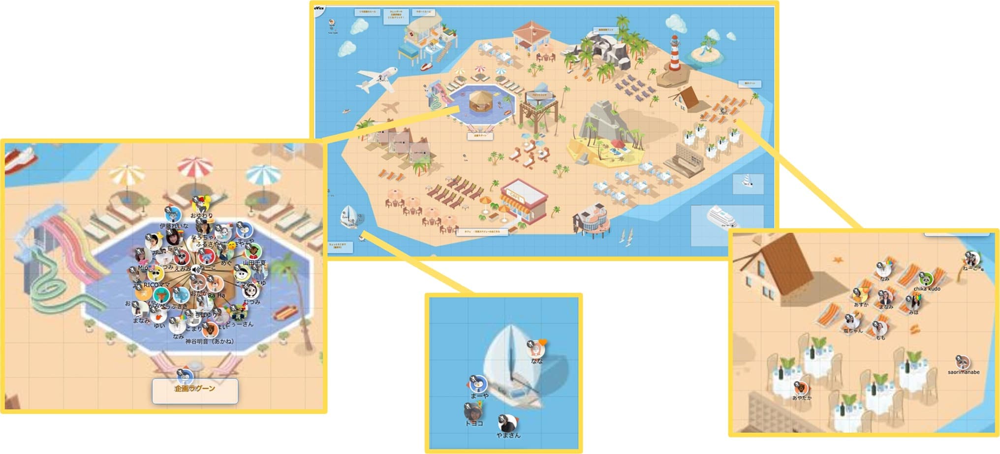 もくもくと集中作業するもよし、仕事の合間に雑談をするもよし。実際のオフィスのように多様なコミュニケーションが可能です。